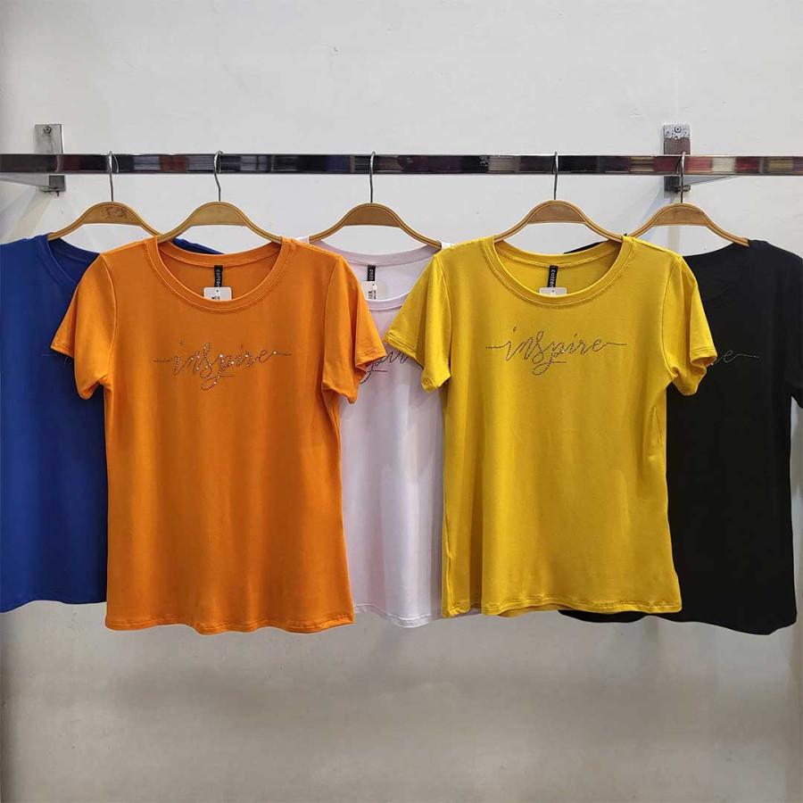 Blusa viscolycra estampada, com gola redonda e manga curta