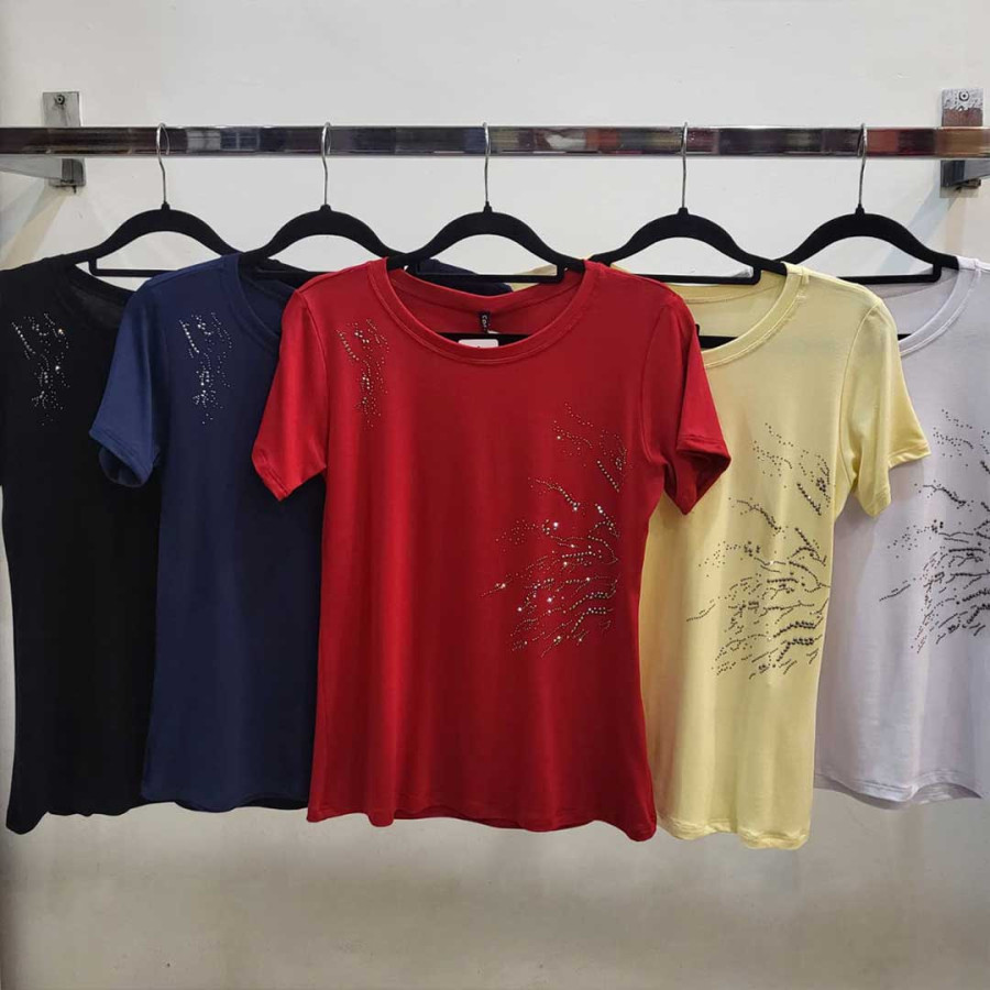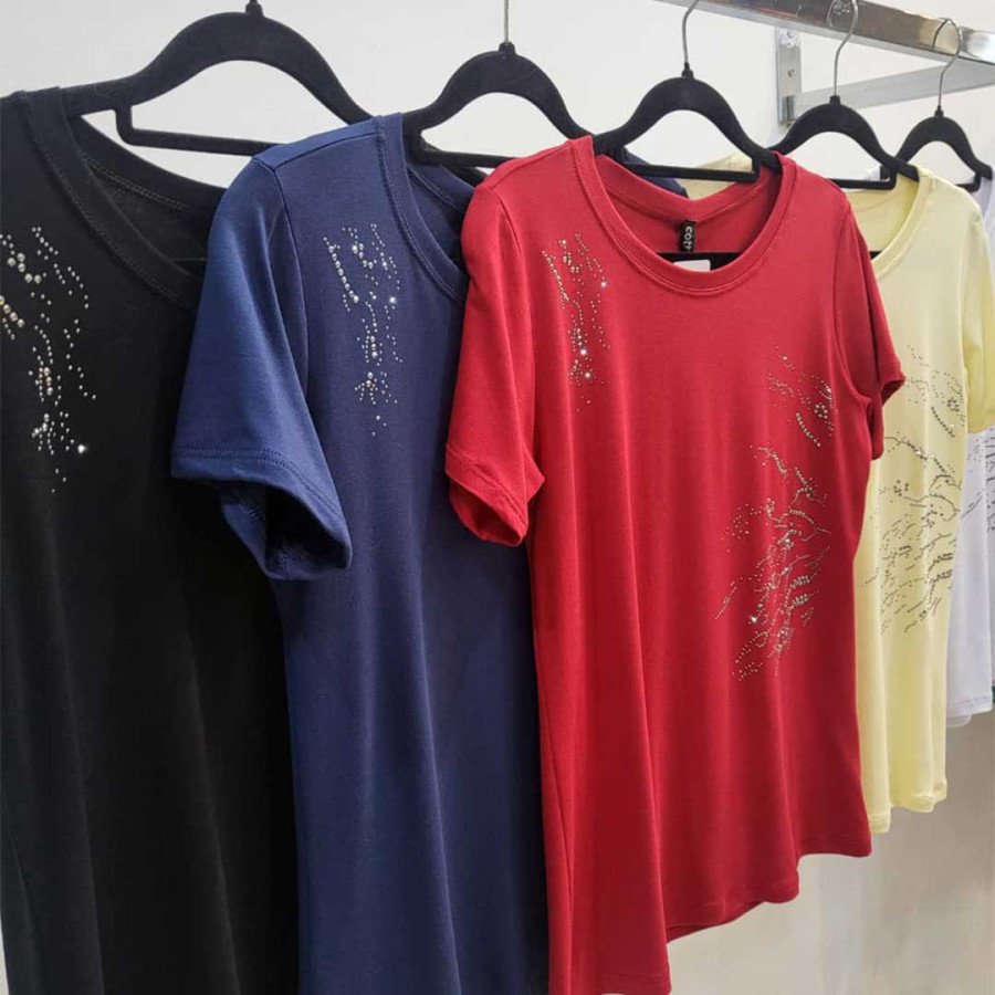 Blusa viscolycra estampada, com gola redonda e manga curta